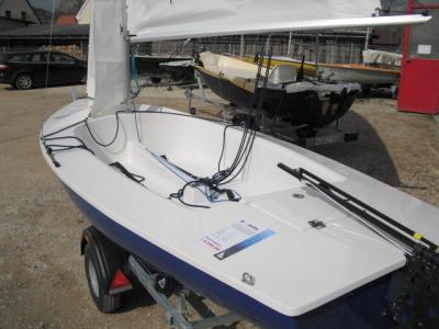 Rumpf/Cockpit: Rundspant-Zweischalenbauweise in GfK-Handauflegeverfahren unsinkbar großes, hochbordiges Cockpit, rundum geschlossen rutschfestes Profil im Cockpitboden verstellbare Ausreitgurte für Vorschoter und Steuermann Lenzrinnen, vertiefter Lenzbrunnen mit Elvströmlenzer geschlossener Schwertkasten große, abschließbare Stauräume im Vor- und Achterschiff breiter Süllrand mit durchgehenden Griffmulden Höhe des Baumes über dem Cockpitboden: 1.10 m Farbe: Rumpf, Schwert und Ruderblatt: dunkelblau Deck und Cockpit: weiß Rigg: Mast und Saling aus Aluminium innenlaufende Fallen Mastspur aus Edelstahl mit Mastfußbolzen zum Verstellen des Mastes Aluminiumbaum mit Lümmelbeschlag aus Edelstahl Edelstahlbügel für Baumniederholer, Großschot, Unterliekstrecker und Dirk Omegabügel, Umlenkblock und Klampe für Smeerreep Vorstag und Wanten aus Edelstahl Edelstahl-Wantenspanner Umlenkrollen für im Mast laufende Fallen Blöcke und Beschläge für Spinnaker drei Belegklampen für Fock-, Groß- und Spifall Verklicker Baumniederholer Schoten, Fallen und Dirk Segel: Großsegel, 7,20 m2, 4 Segellatten, Bindereff mit 3 Reffbändseln, Smeerrep Segelzeichen und fortlaufende Segelnummern Fock, 4,60 m2, mit Klarsichtfenster und Kunststoff-Stagreitern zwei Segelsäcke Schwert: GfK-Profilschwert Senkschwert stufenlos verstellbar Auf- und Niederholer zwei Kammklemmen Ruderanlage: Profiliertes GfK-Senkruder Aluminium-Ruderhaus Aluminium-Pinne teleskopierbarer Pinnenausleger mit Halteclip am Ruderhaus Ausleger durch ein austauschbares Kunststoffgelenk um 360° schwenk- und hochklappbar Auf- und Niederholer in verschiedenen Farben zwei Belegklampen Ruder-Sicherungsclip Beschläge: Vorstagbeschlag mit Auge für Vorleine jeweils zwei Edelstahl-U-Bolzen an Bug und Heck (für Festmacher) Edelstahl-Püttings und -Spanner für Wanten zwei Fockschot-Leitschienen mit Schlitten und verstellbaren Wirbel-Leitösen zwei Fockschot-Curryklemmen Großschotführung: zwei Violinblöcke mit Wirbel, kugelgelagert, Curryklemme zum Belegen der Großschot Baumniederholer |
